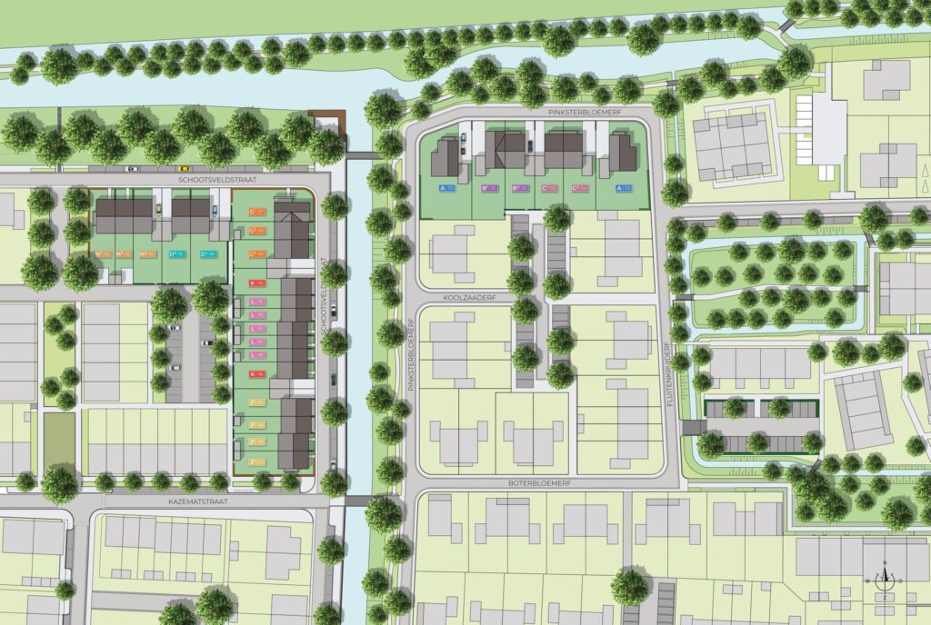 Aan de sierlijke Meander in deelgebied De Erven en Het Dorpshart komen 6 prachtige twee-onder-een-kapwoningen van type B, C en D. Voor deze typen is er volop keuze in de ligging. De woningen hebben gemeen dat alle gevels rijk gedetailleerd zijn van de hand van architectenbureau Schippers Architecten BNA.