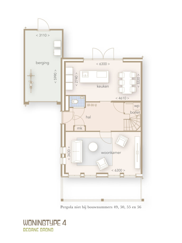 Vanuit de zijentree is er toegang tot de woning. De hal biedt toegang tot de ruime woonkamer en separate woonkeuken, het toilet, de trapopgang naar de eerste verdieping en de trapkast waar de technische installaties, waaronder de WTW ventilatie unit en de bodemwarmtepomp, zich bevinden. Het voordeel van deze pomp is dat de vloeren in de zomer ook gekoeld kunnen worden en de woning geheel gasloos is. Het sanitair en tegelwerk van het toilet is inbegrepen in de koopsom en, indien gewenst, te upgraden naar eigen smaak en stijl. In de basis wordt er een hoogwaardige kwaliteit toegepast.