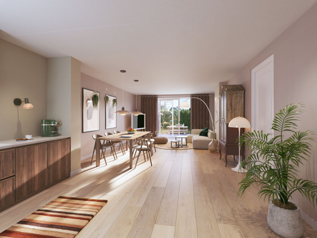 Van ‘s ochtends vroeg tot laat in de middag kun je van de zon genieten in je tuin. Er is plaats genoeg voor bakken met boompjes, planten en bloemen en een fijne lounge-set. Zet de pui in je woonkamer open en haal het buitenleven binnen