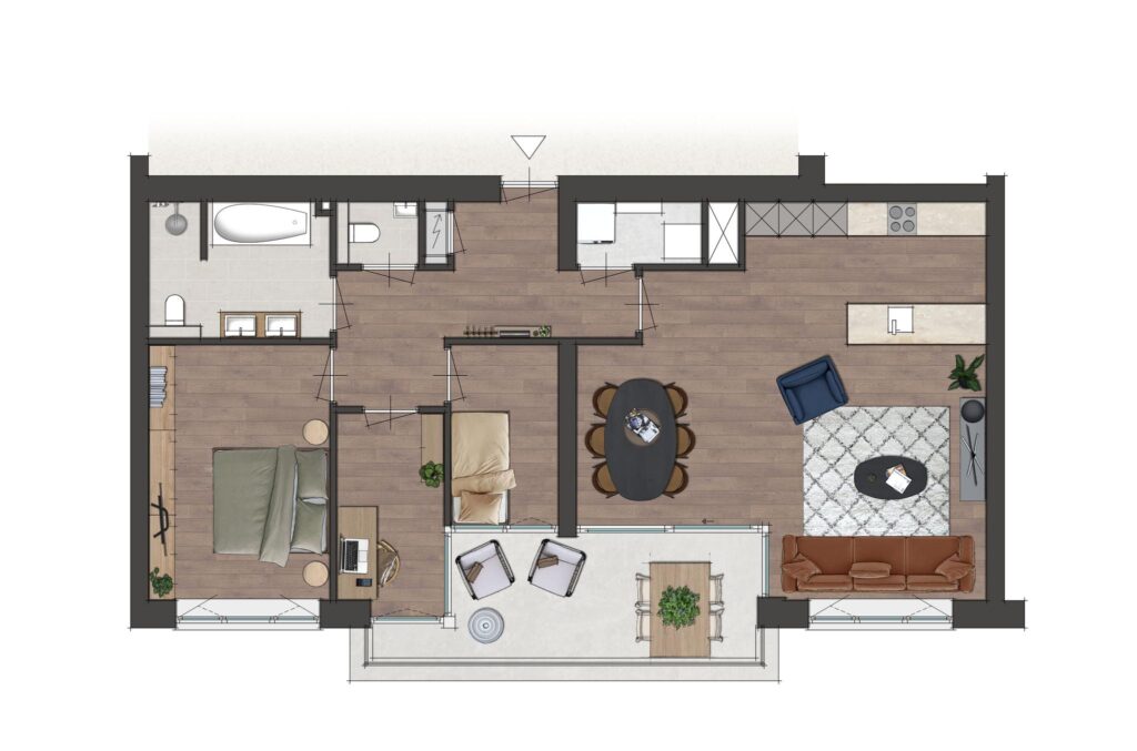 In de appartementen van type A vind je 3 slaapkamers, waarvan 1 de master bedroom is. De andere 2 slaapkamers zijn ideaal en je kunt het ook gebruiken als thuiskantoor. Op je extra grote balkon op het westen geniet je van de zonnestralen tot het eind van de dag.