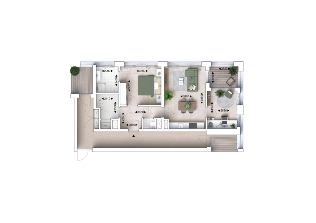 Bij binnenkomst stap je direct binnen in de open keuken, die centraal in het appartement ligt. De keuken is ruim opgezet en biedt voldoende werk- en opbergruimte. Aansluitend is er ruimte voor een grote eettafel, waardoor koken en tafelen hier op een natuurlijke manier samenkomen. Aan de linkerzijde van de keuken bevindt zich de sfeervolle woonkamer. Deze is voorzien van grote ramen en een deur naar het balkon op het zuiden of westen. Een ideale plek om te ontspannen en te genieten van het buitenleven. Aan de achterzijde van het appartement ligt de master-bedroom, met ruimte voor een tweepersoonsbed en kledingkast. Via een centrale hal zijn de overige ruimtes bereikbaar. Direct naast de master-bedroom bevindt zich de badkamer, voorzien van een inloopdouche en wastafel. Ook bevindt zich in de hal een separaat toilet. Aan de rechterzijde van de woning bevindt zich een tweede slaapkamer. Deze kamer kan ook uitstekend dienen als werkkamer of logeerkamer.