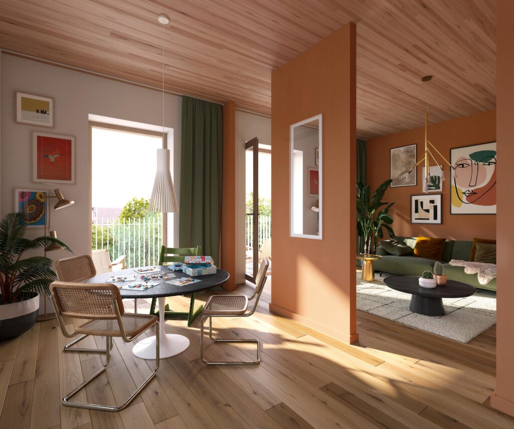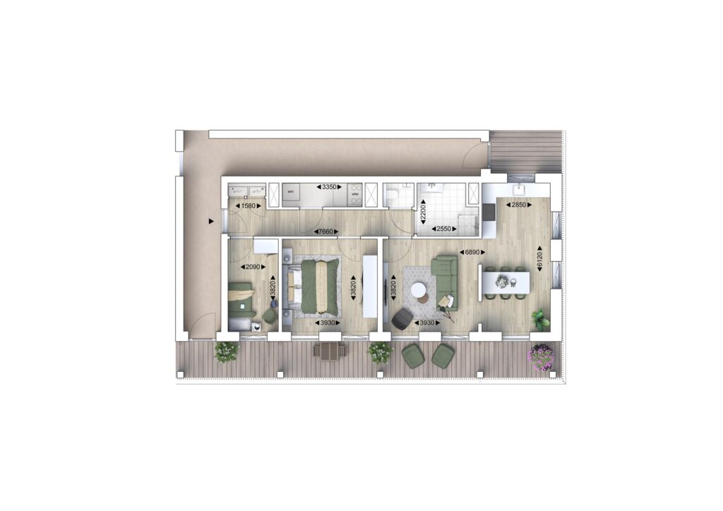 Bij binnenkomst stap je direct binnen in de open keuken, die centraal in het appartement ligt. De keuken is ruim opgezet en biedt voldoende werk- en opbergruimte. Aansluitend is er ruimte voor een grote eettafel, waardoor koken en tafelen hier op een natuurlijke manier samenkomen. Aan de linkerzijde van de keuken bevindt zich de sfeervolle woonkamer. Deze is voorzien van grote ramen en een deur naar het balkon op het zuiden of westen. Een ideale plek om te ontspannen en te genieten van het buitenleven. Aan de achterzijde van het appartement ligt de master-bedroom, met ruimte voor een tweepersoonsbed en kledingkast. Via een centrale hal zijn de overige ruimtes bereikbaar. Direct naast de master-bedroom bevindt zich de badkamer, voorzien van een inloopdouche en wastafel. Ook bevindt zich in de hal een separaat toilet. Aan de rechterzijde van de woning bevindt zich een tweede slaapkamer. Deze kamer kan ook uitstekend dienen als werkkamer of logeerkamer.