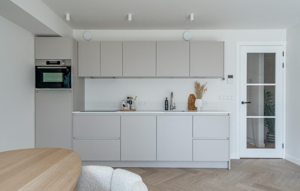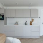 De moderne open keuken is in lichte kleurstelling is voorzien van diverse inbouwapparatuur waaronder inductiekookplaat, afzuigkap, vaatwasser, combimagnetron en een koelkast en met een composiet aanrechtblad. Het appartement heeft twee slaapkamers van respectievelijk 6 en 10m2.