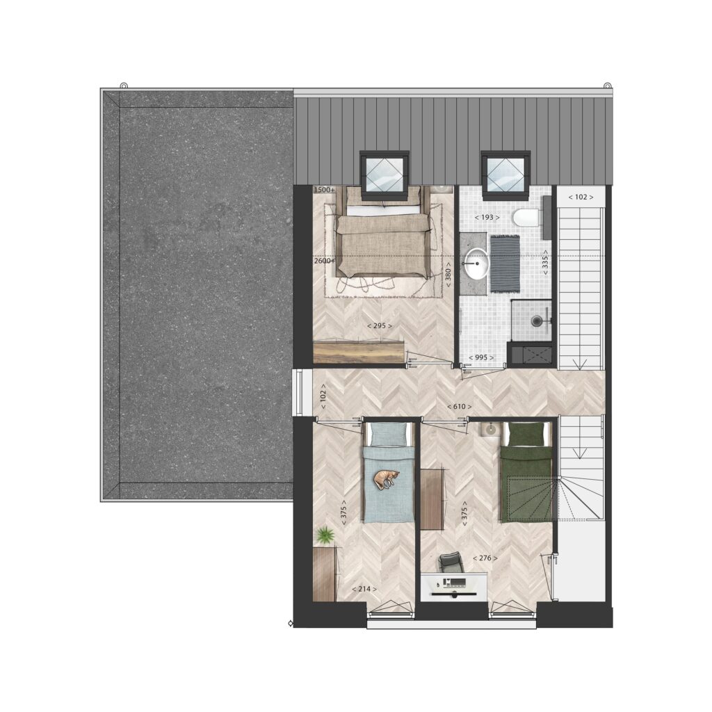 Op de eerste verdieping bevinden zich drie ruime slaapkamers en een luxe afgewerkte badkamer met inloopdouche, wastafel en wandcloset. De tweede verdieping biedt een vierde slaapkamer en een afgesloten techniekruimte met aansluitingen voor de wasmachine en droger – praktisch en netjes uit het zicht.