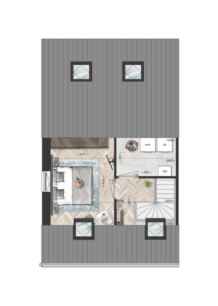 Op de eerste verdieping bevinden zich drie ruime slaapkamers en een luxe badkamer met inloopdouche, wastafel en toilet. De tweede verdieping is ingericht met een vierde slaapkamer en een praktische technische ruimte met aansluitingen voor wasapparatuur, waardoor alles netjes en overzichtelijk blijft.