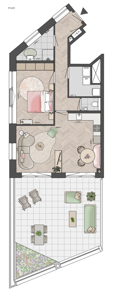 Zo heeft P-5-01 een ruime slaapkamer en een woonkamer met dubbele openslaande deuren naar het royale terras van 43 m². Heb je binnen liever meer ruimte dan buiten en gaat je voorkeur uit naar een unieke plattegrond, dan is P-5-02 waarschijnlijk iets voor jou met 80 m² woonoppervlakte en een terras van nog steeds 20 m².