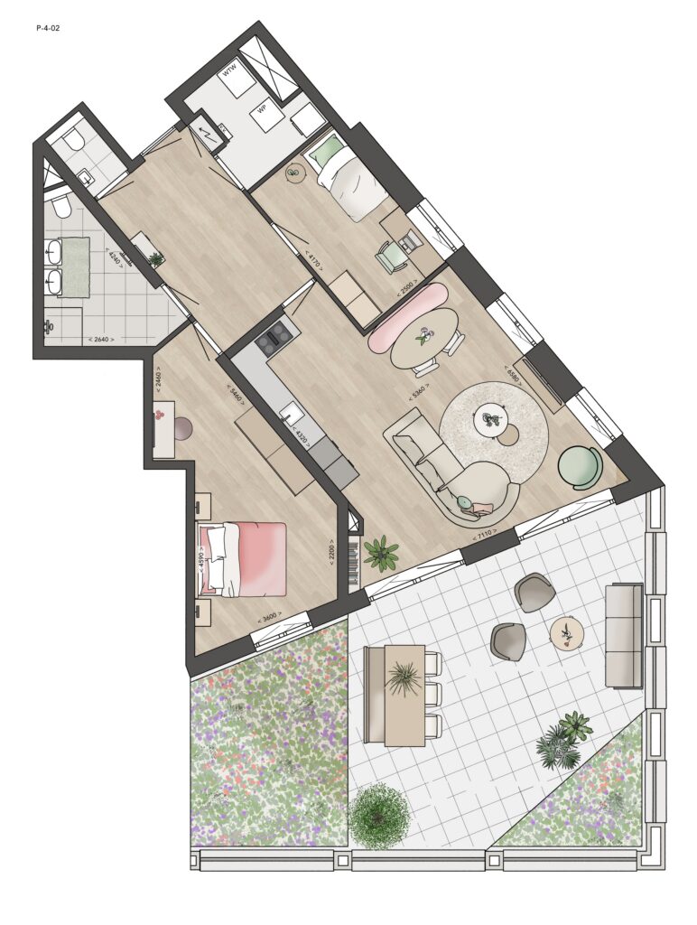 – Appartement P-4-02 is gelegen op de vierde verdieping van het Poortgebouw en heeft een woon-/eetkamer grenzend aan een groot en groen terras met prachtig uitzicht over het binnenterrein. De twee slaapkamers, badkamer en het separate toilet maken het appartement compleet.