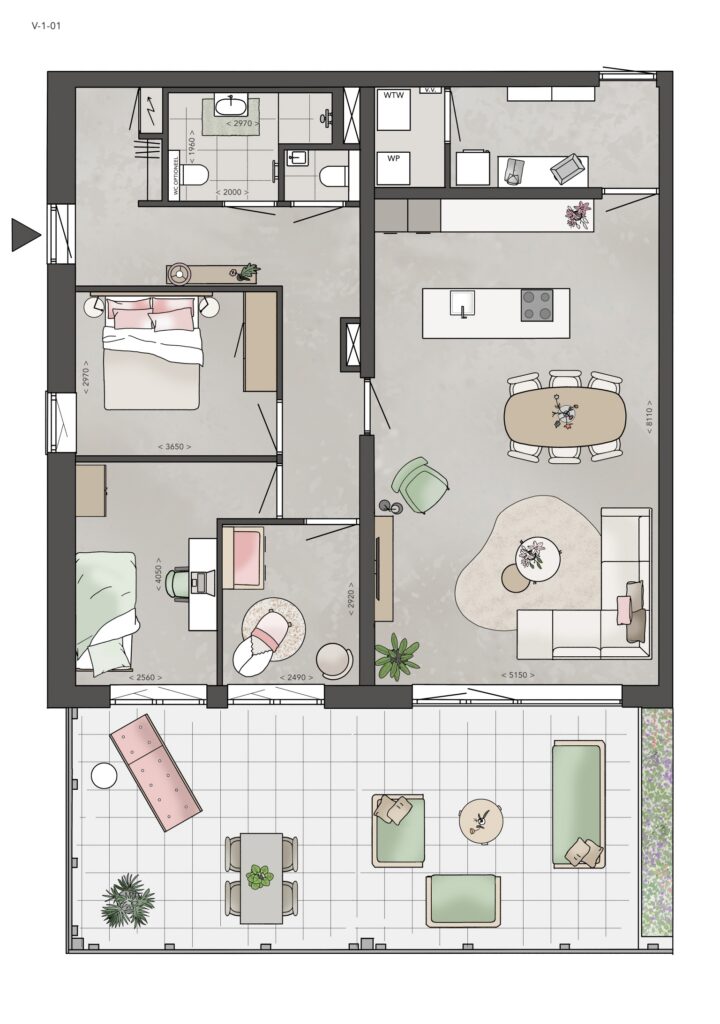 – De Magnifique appartementen V-1-01 t/m V-1-08 in het Valleigebouw zijn royaal en hebben een woonkamer grenzend aan het grote terras met uitzicht op de schapenweide, een open keuken met kook- en spoeleiland, drie slaapkamers, een badkamer, toilet en een inpandige berging met directe toegang tot de parkeergarage.