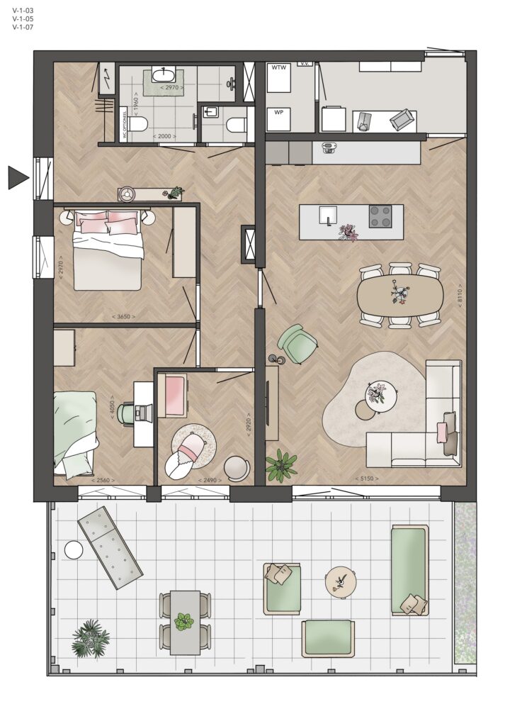 – De Magnifique appartementen V-1-01 t/m V-1-08 in het Valleigebouw zijn royaal en hebben een woonkamer grenzend aan het grote terras met uitzicht op de schapenweide, een open keuken met kook- en spoeleiland, drie slaapkamers, een badkamer, toilet en een inpandige berging met directe toegang tot de parkeergarage.