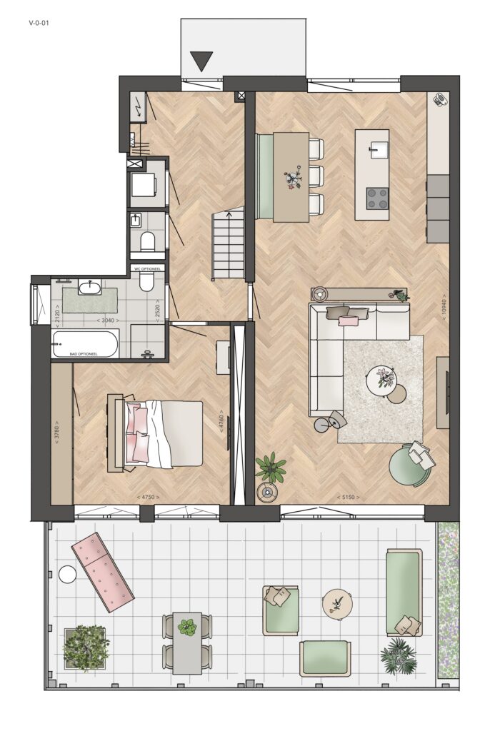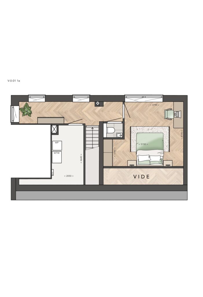 – Appartement V-0-01 in het Valleigebouw heeft twee verdiepingen. Je kan gelijkvloers wonen met een woonkamer, keuken, slaapkamer en badkamer op de begane grond. Daarnaast is er op de eerste verdieping een extra slaapkamer, tweede toilet en techniekruimte.