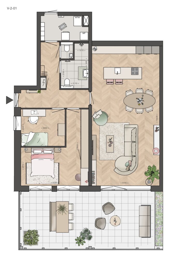 – Appartement V-0-01 in het Valleigebouw heeft twee verdiepingen. Je kan gelijkvloers wonen met een woonkamer, keuken, slaapkamer en badkamer op de begane grond. Daarnaast is er op de eerste verdieping een extra slaapkamer, tweede toilet en techniekruimte.