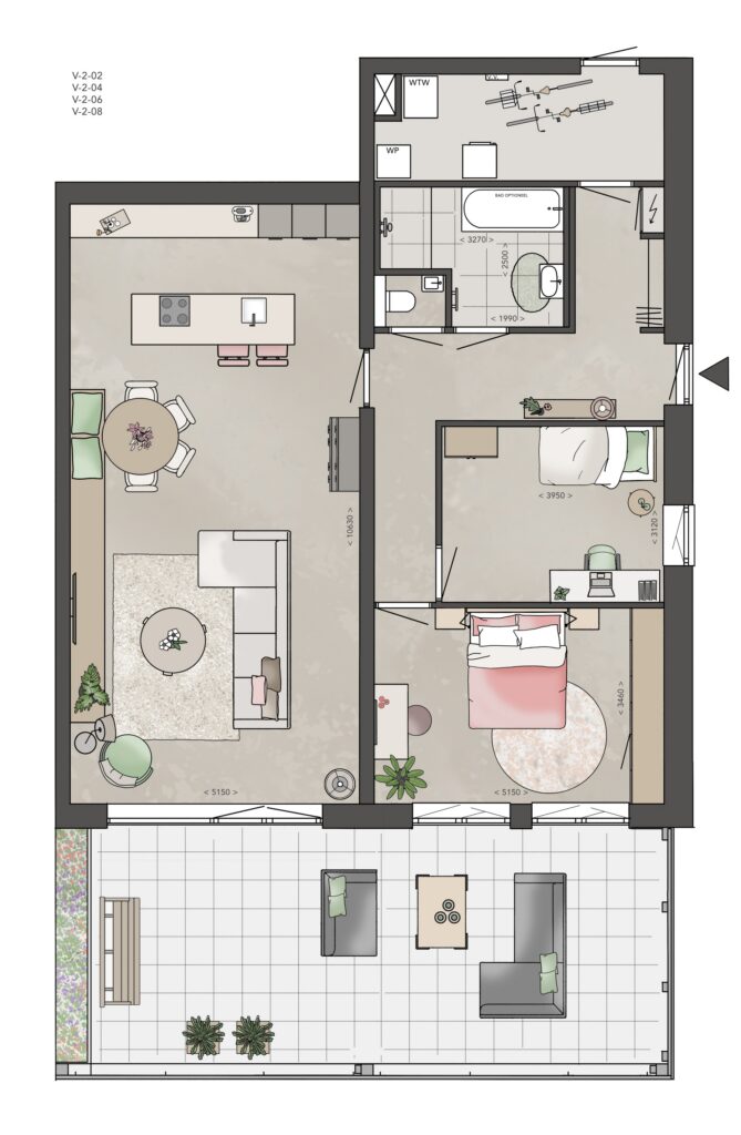 – Appartement V-0-01 in het Valleigebouw heeft twee verdiepingen. Je kan gelijkvloers wonen met een woonkamer, keuken, slaapkamer en badkamer op de begane grond. Daarnaast is er op de eerste verdieping een extra slaapkamer, tweede toilet en techniekruimte.