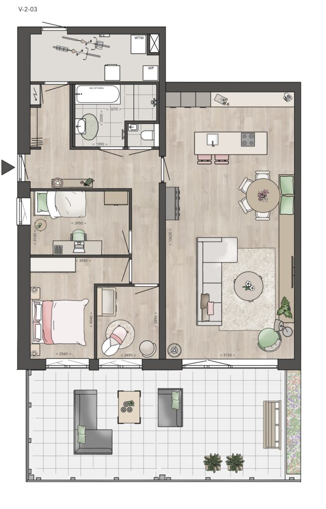 – Appartement V-0-01 in het Valleigebouw heeft twee verdiepingen. Je kan gelijkvloers wonen met een woonkamer, keuken, slaapkamer en badkamer op de begane grond. Daarnaast is er op de eerste verdieping een extra slaapkamer, tweede toilet en techniekruimte.