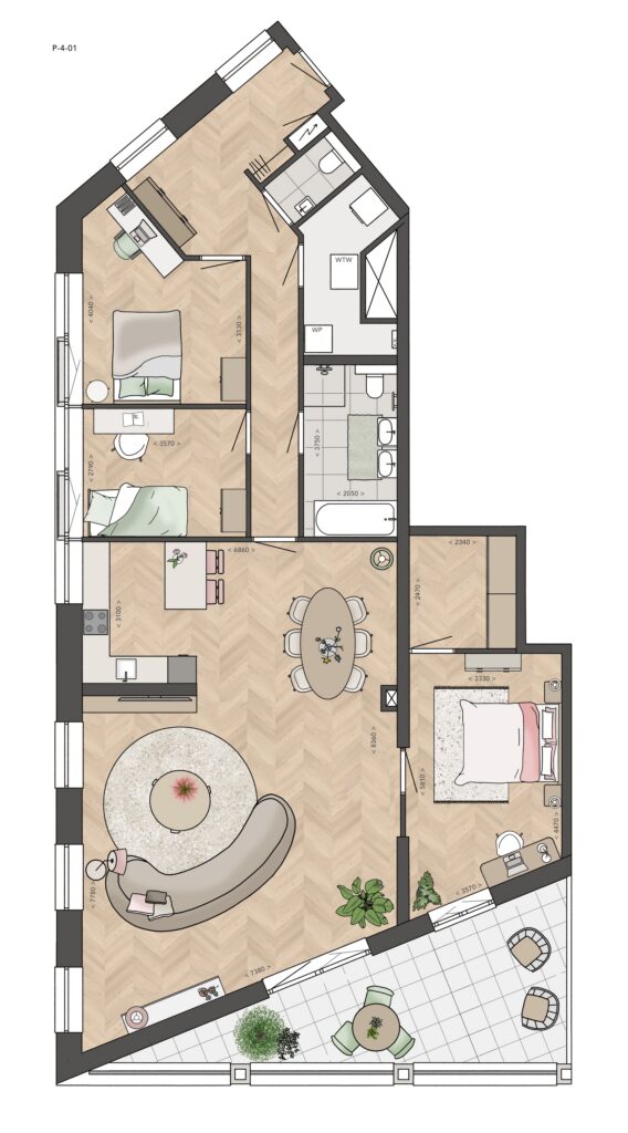 – P-2-01 en P-3-01 in het Poortgebouw zijn identiek en die van P-4-01 wijkt qua vorm van het terras, de woon- en slaapkamer net iets af. Het zijn heerlijke, royale vierkamerappartementen met diverse inrichtingsmogelijkheden.