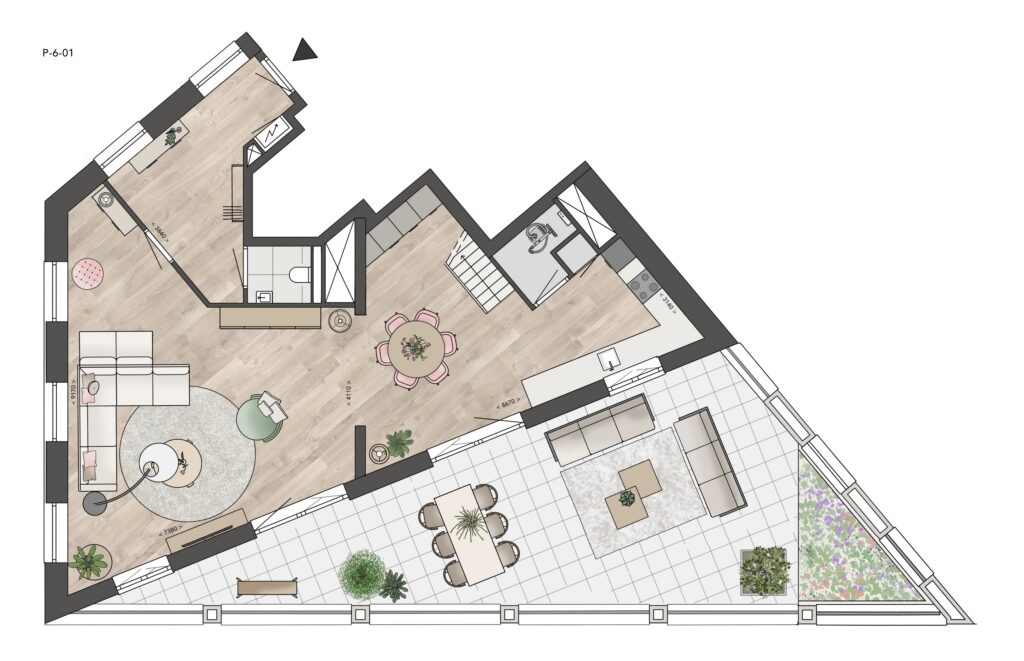 – Penthouse P-6-01 is uniek en met 181 m² woonoppervlakte, verdeeld over de twee bovenste verdiepingen (6e en 7e) van het Poortgebouw, het grootste appartement van Bellevue. De vide zorgt voor een extra ruimtelijke beleving en het royale terras van 55m² met fraai uitzicht en privacy maakt het geheel compleet.