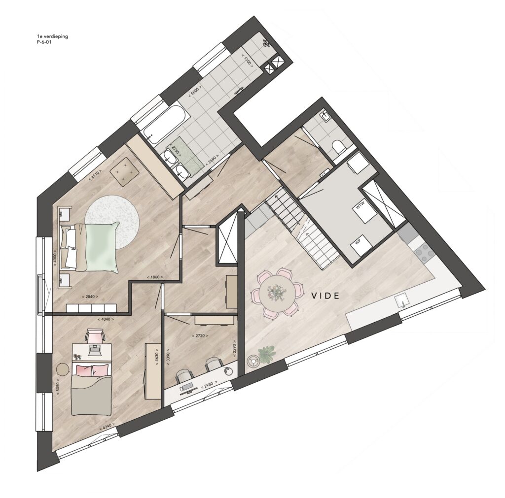 – P-2-01 en P-3-01 in het Poortgebouw zijn identiek en die van P-4-01 wijkt qua vorm van het terras, de woon- en slaapkamer net iets af. Het zijn heerlijke, royale vierkamerappartementen met diverse inrichtingsmogelijkheden.