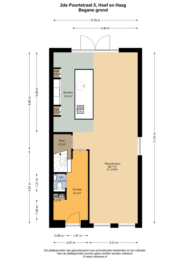 De ruime hal van ca. 8 m² geeft toegang tot de woonkamer en woonkeuken. De leefruimte van ca. 52 m² strekt zich uit over ruim 11,7 meter en is dankzij de hoekligging en vele ramen heerlijk licht. Aan de voorzijde geniet je van een vrij uitzicht richting de Meander, een groot pluspunt in deze populaire wijk.