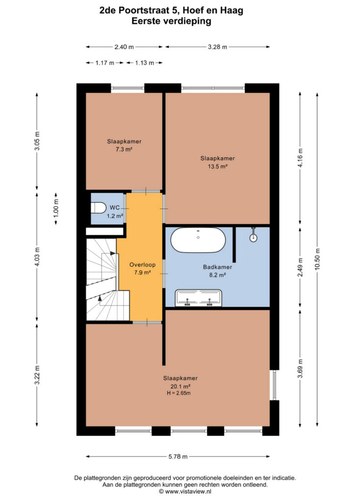 De overloop biedt toegang tot drie slaapkamers van ca. 20, 14 en 7 m². De hoofdslaapkamer aan de voorzijde heeft eveneens vrij uitzicht en biedt ruimte om — indien gewenst — twee kamers te creëren.