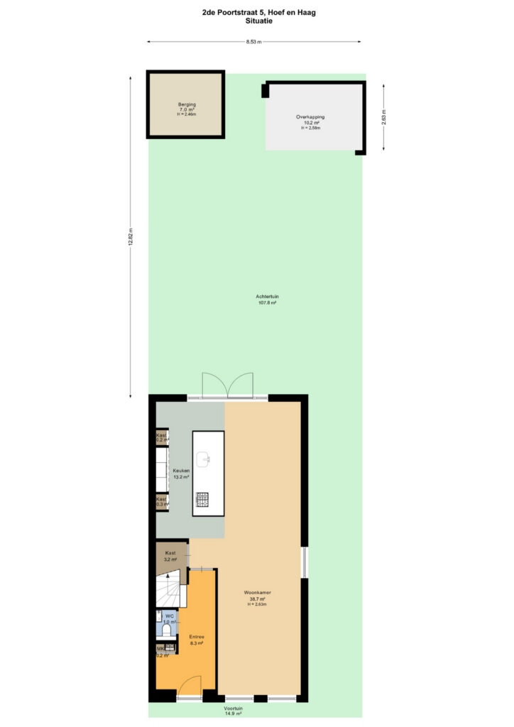 – Diepe achtertuin met overkapping (2019), berging en achterom.