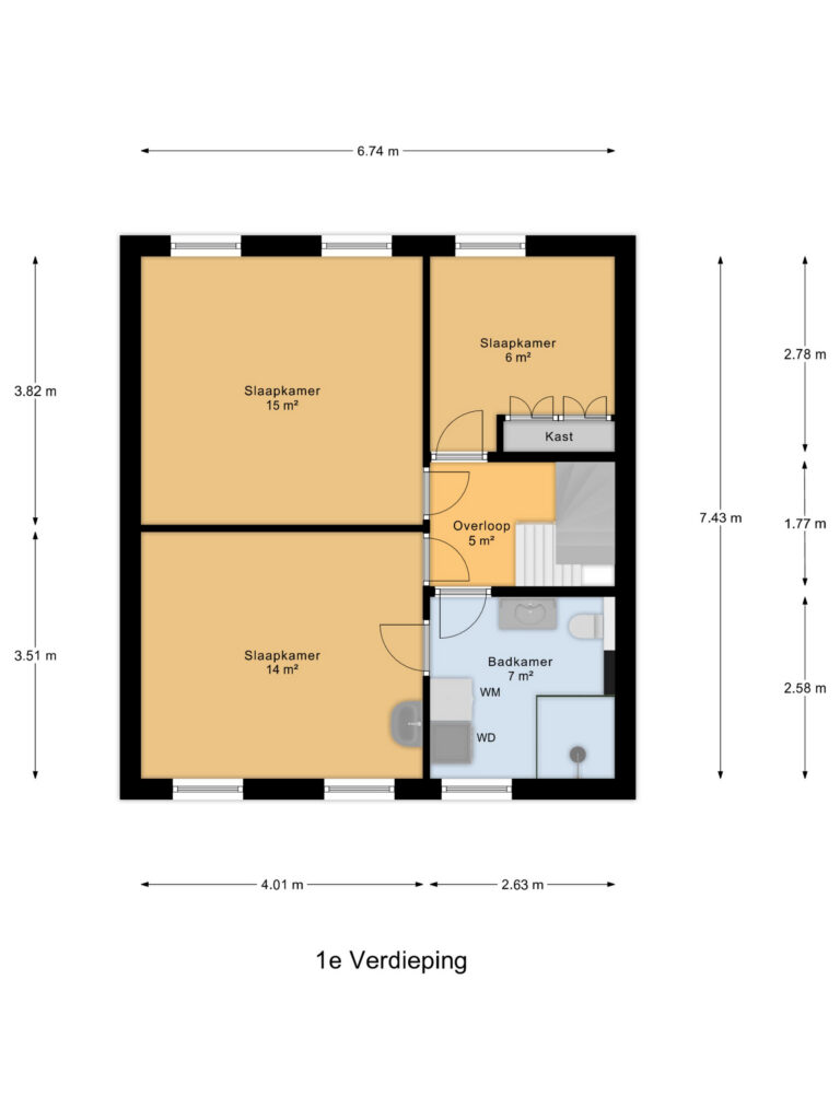 Drie ruime slaapkamers van 6, 14 en 15 m² groot. Twee slaapkamers bevinden zich aan de tuinzijde. De badkamer is met 7 m² heerlijk ruim en is voorzien van douche, toilet, wastafelmeubel, designradiator en groot raam welke ook open gezet kan worden. De badkamer is in lichte kleurstelling. Hier bevindt zich ook de opstelling van de wasmachine en droger.