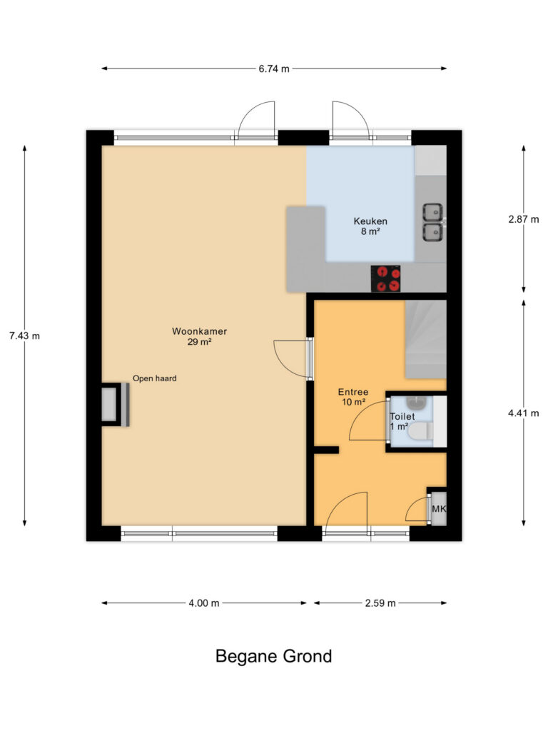 Ruime voortuin, entree met meterkast, toilet en toegang naar de woonkamer. De woonkamer met keuken is in speelse L-vorm. De woonkamer is circa 29 m² groot, voorzien van openhaard en grote raampartijen. De halfopen keuken is wit van kleurstellig en biedt veel ruimte. Veel opbergmogelijkheden en werkblad. Inbouwapparatuur is aanwezig. Via de keuken bereik je de fijne, brede achtertuin (circa 91 m² groot). De achtertuin ligt op het oosten en hier heb je flink veel privacy. Er is een achterom en een ruime stenen berging aanwezig.