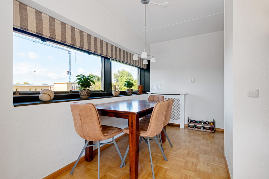 De lichte woonkamer is een heerlijke leefruimte met een extra zijraam én een grote schuifpui naar het zonnige balkon van maar liefst 12 m², gelegen op het zuidoosten. Hier zit je heerlijk rustig, met volop zon maar zonder drukte, een ontspannen plekje aan de rand van de stad.