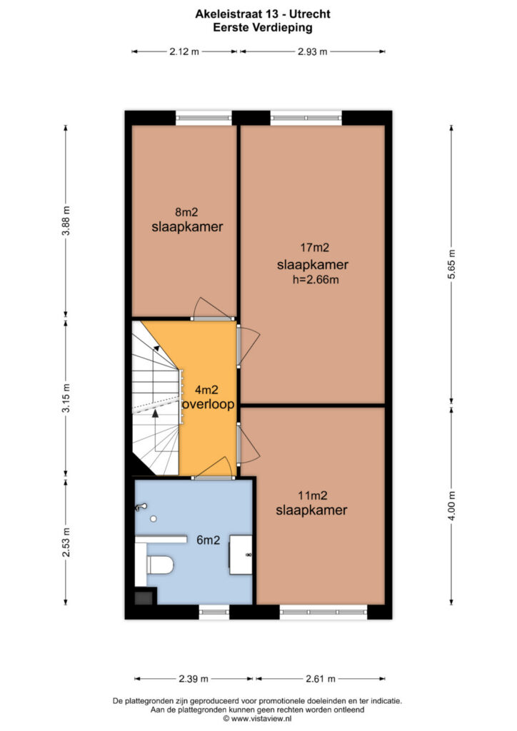Eerste verdieping; Overloop met toegang tot drie ruime slaapkamers (17, 11 en 8 m²), en de moderne badkamer aan de voorzijde. De badkamer is compleet uitgevoerd met een comfortabele inloopdouche, tweede zwevend toilet en een wastafelmeubel met spiegel. Hij is mooi tot aan het plafond betegeld en er is naast mechanische afzuiging ook een raam aanwezig voor daglicht en de mogelijkheid tot natuurlijk ventileren.