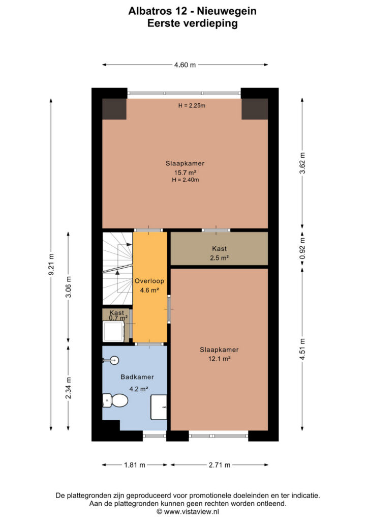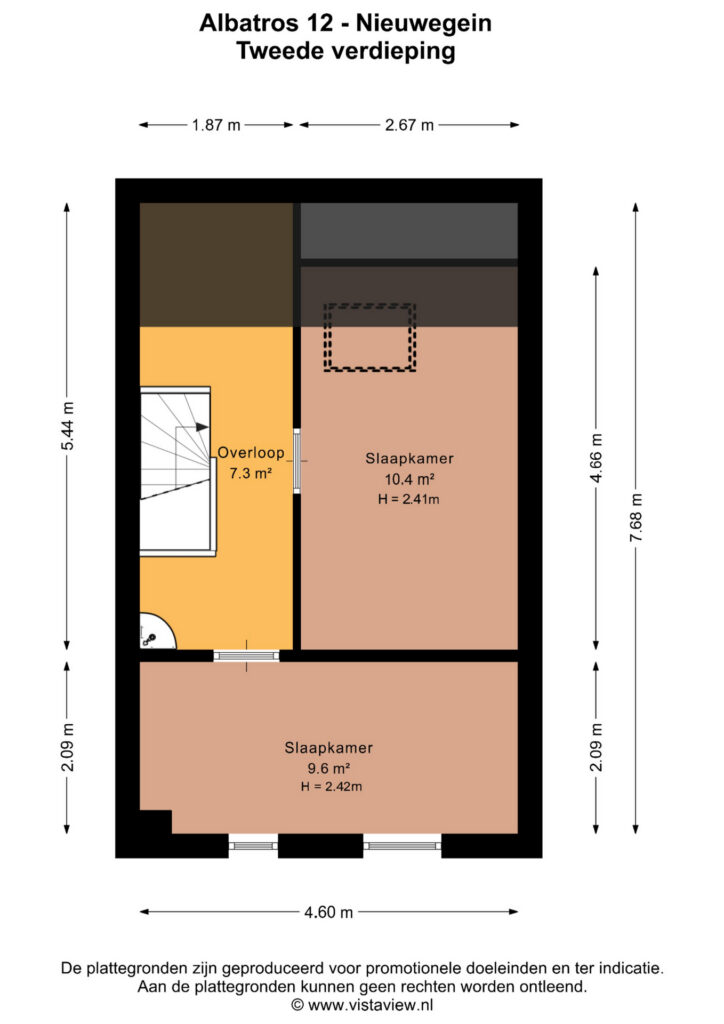 Landing with access to two spacious bedrooms of approximately 12 m² and 16 m² respectively. The largest bedroom includes a walk-in closet and a full-width dormer window.