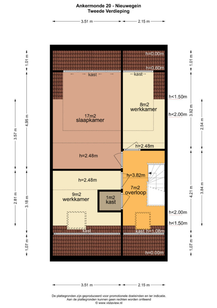 Overloop met berging, drie slaap-/werkkamers van respectievelijk 9, 17 en 8 m² groot. Afgesloten stookruimte voor de heteluchtverwarming.