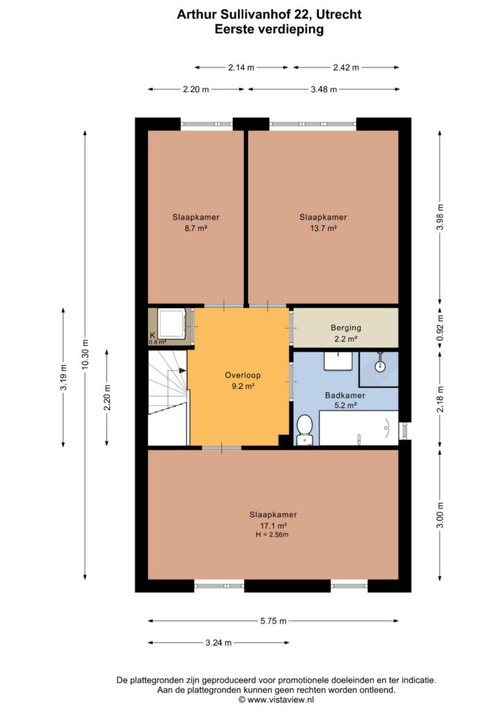 Eerste verdieping; Ook op de eerste verdieping ervaar je direct het gevoel van ruimte. De royale overloop van maar liefst 9,2 m² geeft toegang tot drie slaapkamers, een berging, een wasruimte en de badkamer.