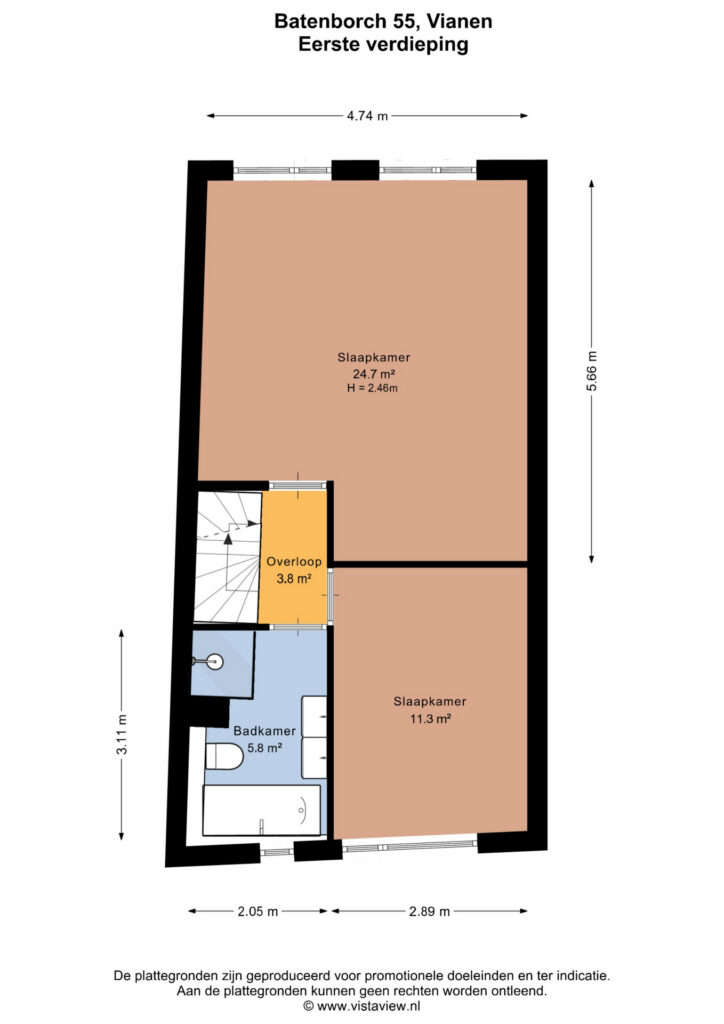 Op de eerste verdieping bevinden zich twee slaapkamers van ca. 25 en 11 m², en de moderne badkamer van ca. 6 m². De gehele verdieping is afgewerkt met een PVC vloer. De slaapkamer aan de achterzijde is royaal van formaat en fungeert momenteel als master bedroom. Door de afmetingen en opzet is deze kamer, indien gewenst, relatief eenvoudig te splitsen in twee separate (slaap)kamers. De slaapkamer aan de voorzijde is eveneens prettig van formaat en goed bruikbaar als slaap-, werk- of logeerkamer.