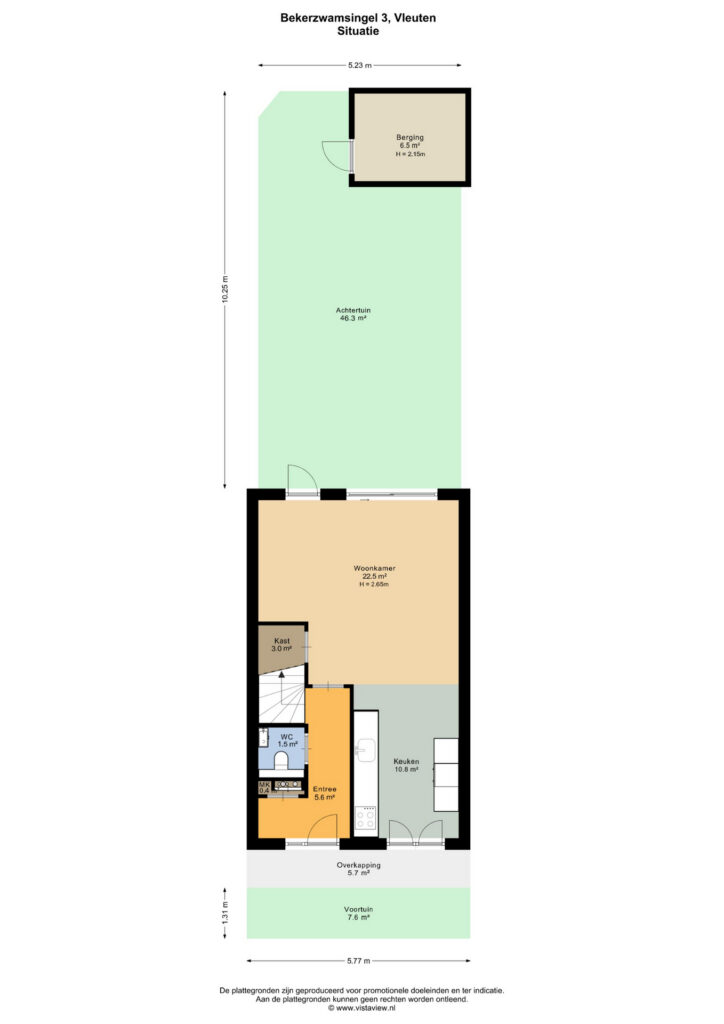 The backyard (approx. 46 m²) is generous and surprisingly deep. Although it faces northeast, its length allows you to enjoy the sun throughout the day. The garden is low-maintenance, with neat paving and plenty of space for a lounge area or dining set. At the back, there’s a large storage shed (approx. 6.5 m²) — perfect for bicycles and garden tools — and the back entrance provides easy access.