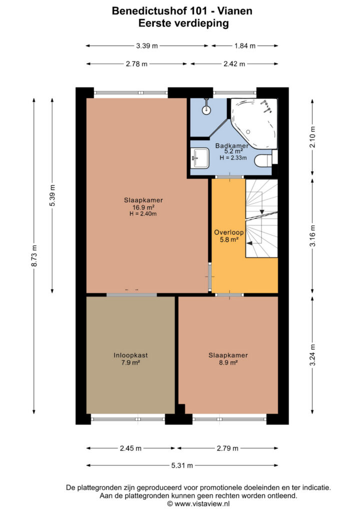 The landing gives access to two spacious bedrooms and the bathroom. The largest bedroom at the rear measures about 17 m² and includes an adjoining walk-in closet of about 8 m², offering a combined 25 m² of practical living and storage space. The bedroom at the front is about 9 m² and ideal as a child’s room, study or guest room. The bathroom is fully equipped with a bathtub, shower, second toilet, washbasin and mirror cabinet.