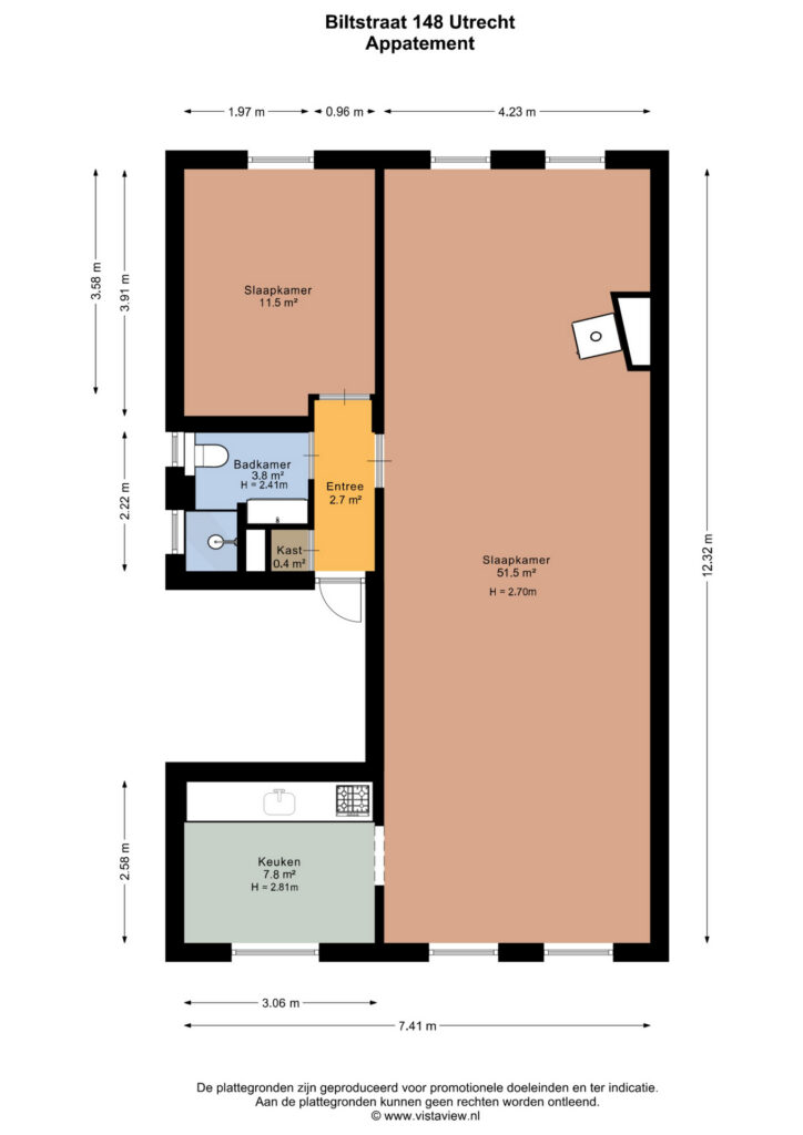 Tweede verdieping: Overloop met vaste kast voor extra bergruimte, toegang tot het appartement. Vanuit de hal met vaste kast heb je toegang tot de slaapkamer van ruim 11 m², de badkamer met douche, toilet en wastafel met meubel en de woonkamer. De woonkamer is maar liefst 51,5 m² en door de raampartijen aan de voor- en achterzijde van het pand heerlijk licht. Indien gewenst is het daardoor goed mogelijk om een 2e slaap- of werkkamer te creëren De halfopen keuken bevindt zich aan de voorzijde van het appartement en beschikt over een gasfornuis, afzuigkap en vaatwasser.