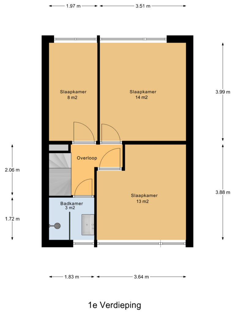 1e verdieping: Overloop, 3 slaapkamers van 14, 13 en 8 m² en de badkamer. De badkamer is voorzien van een inloopdouche, wastafel met meubel en een design radiator.