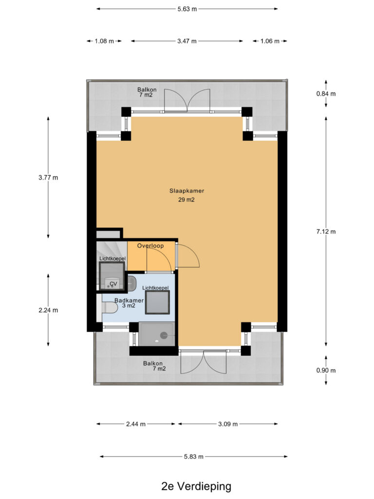 2e verdieping: Overloop, grote slaapkamer van maar liefst 29 m² met eigen badkamer. Deze beschikt over een douche, toilet en wastafel. Aan beide zijden van de slaapkamer is er een balkon over de volledige breedte van 7 m²