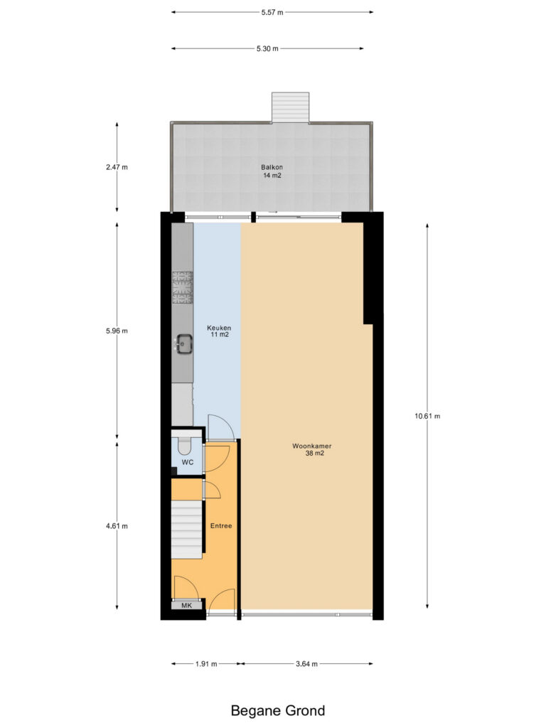 Begane grond: Vanaf straatniveau bereik je via een kleine trap omhoog de voordeur van het huis.
