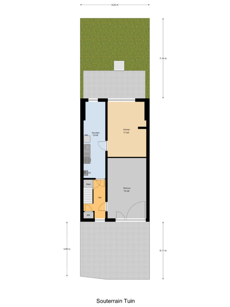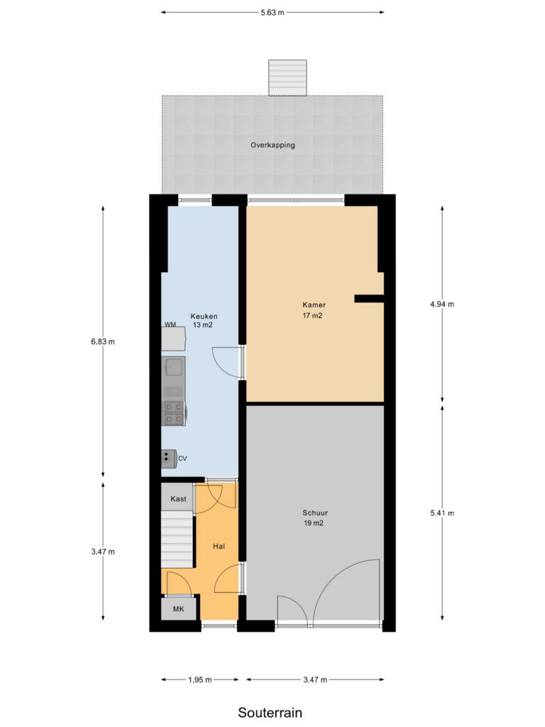 Souterrain: Hal met met meterkast en vaste kast, toegang tot het gedeelte dat thans in gebruik is als schuur. Aparte ruimte waar de aansluiting voor de wasmachine te vinden is, de CV-ketel en een kitchenette. Aparte extra kamer.