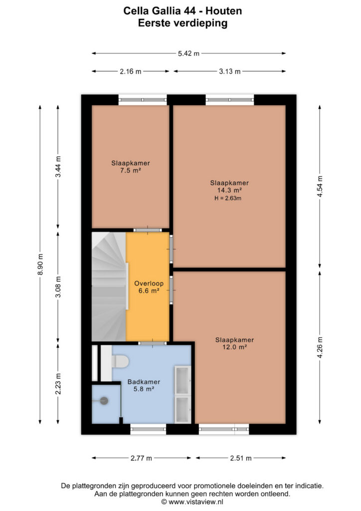 Middels de trapopgang bereik je de overloop van de eerste verdieping. Op deze verdieping tref je drie ruim bemeten slaapkamers en de moderne badkamer. De badkamer is voorzien van inloopdouche, dubbele wastafel met wastafelmeubel en het tweede toilet.