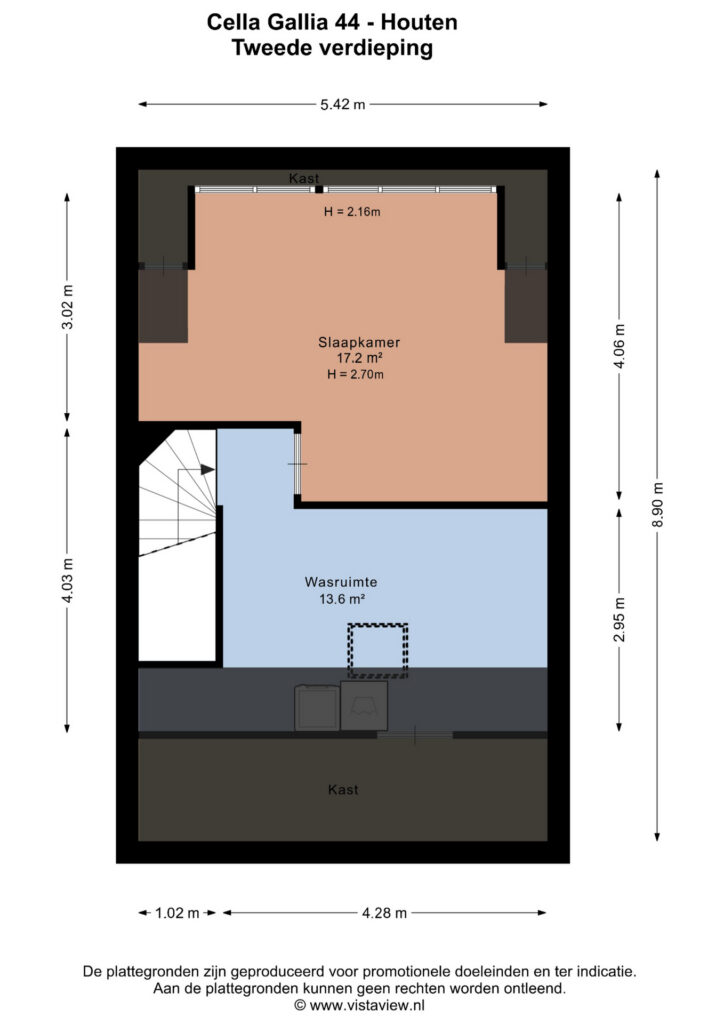 Via de trap bereik je de overloop van de tweede verdieping. Hier tref je de opstelling voor de wasmachine en de droger. Daarnaast vind je hier de ruime vierde slaapkamer, welke eenvoudig is op te splitsen in twee kamers voor bijvoorbeeld een extra werkkamer of hobbyruimte.