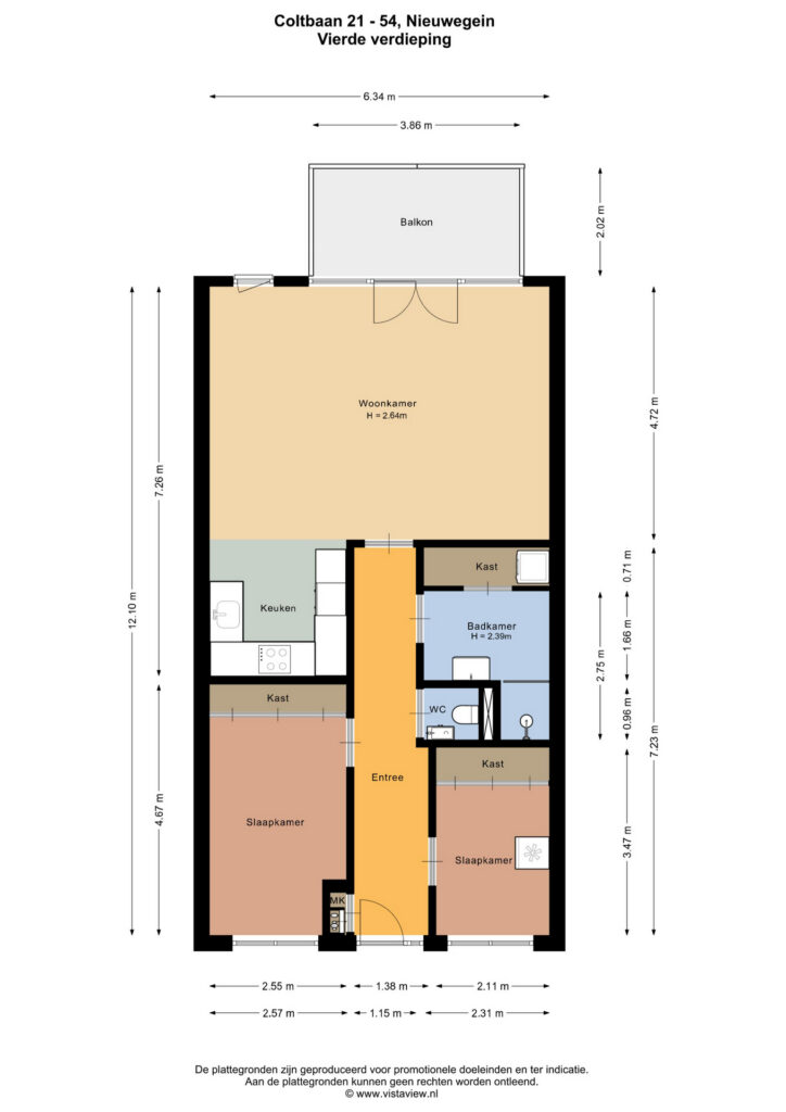 Entree, hal met toegang tot alle vertrekken. De twee slaapkamers liggen aan de voorzijde van het appartement en zijn circa 12 en 7 m² groot. De grootste slaapkamer heeft een vaste kast over de gehele breedte. Ideaal is dat het toilet apart is van de badkamer.