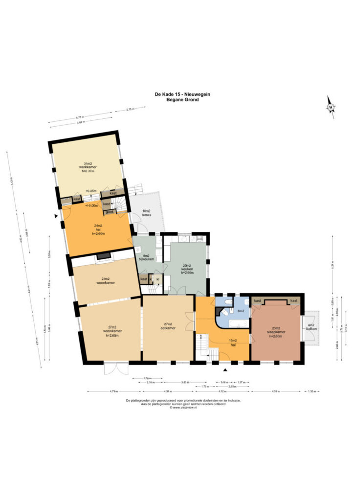 Aan de voorzijde heeft de woning twee verdiepingen, daar zie je de 554 m² woonruimte niet zozeer, aan de achterzijde is de ruimte bet zichtbaar: hier zijn de drie verdiepingen goed zichtbaar. Het souterrain is door zijn verrassende vetrekken en ruime indeling een volwaardige verdieping.