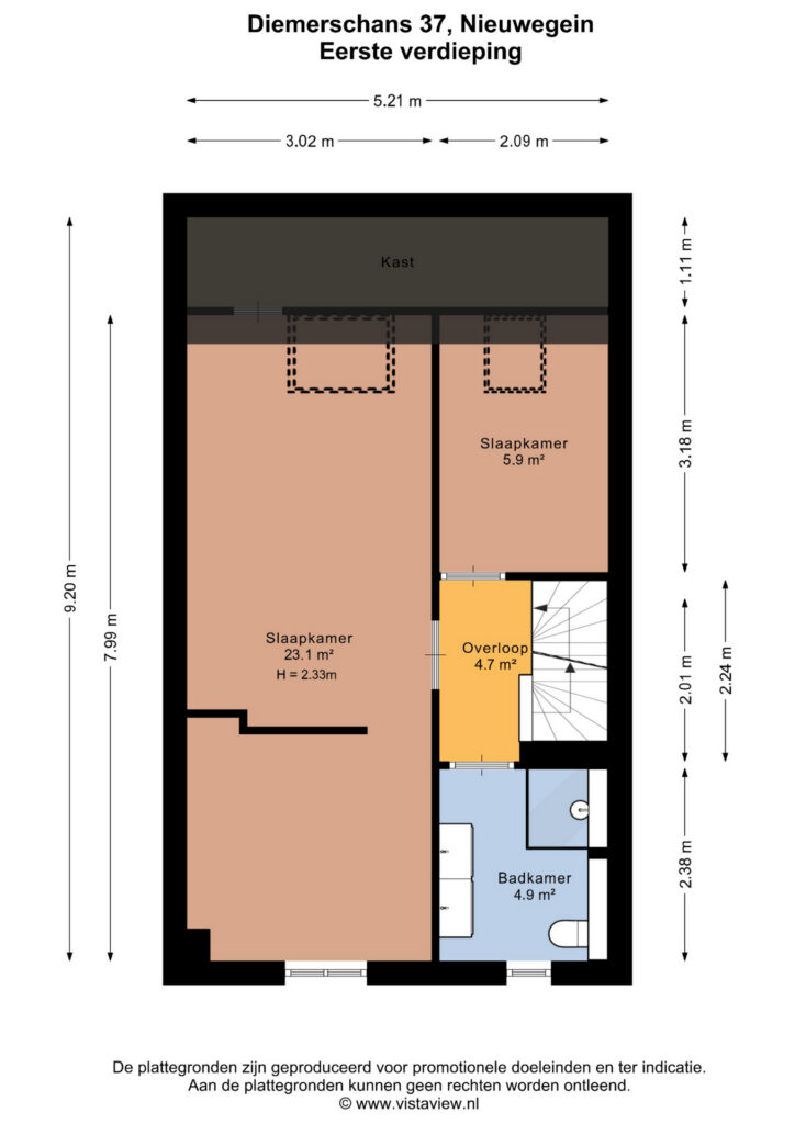 Overloop twee slaapkamers van respectievelijk 23 en 6 m². De grootste slaapkamer is een samenvoeging van twee kamers. Het is eenvoudig mogelijk om de oude indeling weer terug te brengen. De badkamer is fraai en smaakvol verbouwd en beschikt over een inloopdouche, tweede toilet en een dubbele wastafel met meubel.