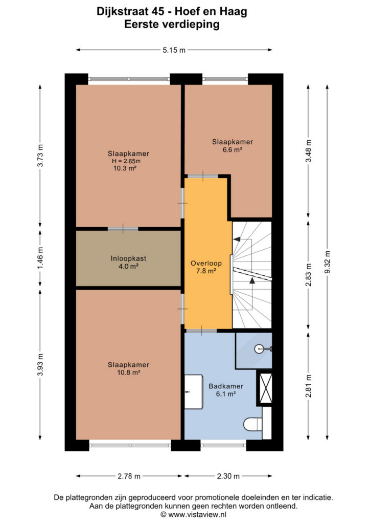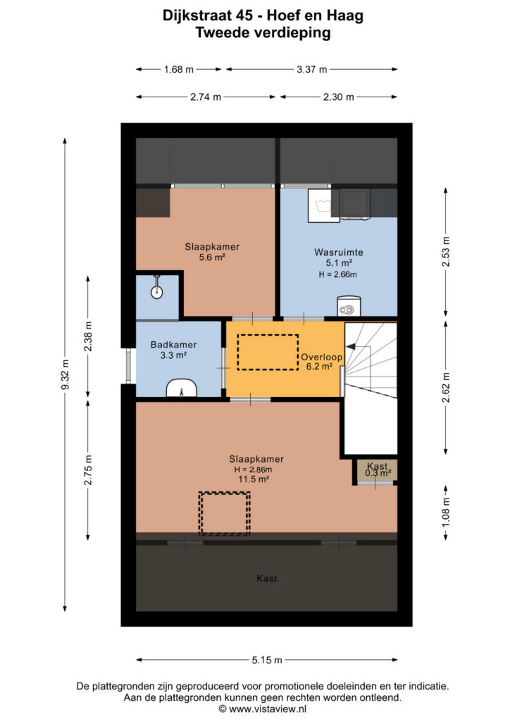 De tweede verdieping is verrassend ruim en licht dankzij de dakkapel aan de achterzijde. Aan de achterzijde bevinden zich de technische-/wasruimte van ca. 5 m² met warmtepomp, witgoedaansluitingen, omvormer van de zonnepanelen en WTW-unit, een slaapkamer van ca. 6 m². De tweede badkamer, centraal gelegen, is praktisch ingedeeld met wastafel en inloopdouche. Aan de voorzijde ligt de tweede slaapkamer van ca. 12 m², voorzien van vaste kasten voor extra opbergruimte en een dakraam. Via de overloop is een vlizotrap bereikbaar naar de vliering voor extra opslag. Ook deze gehele verdieping is voorzien van vloerverwarming.