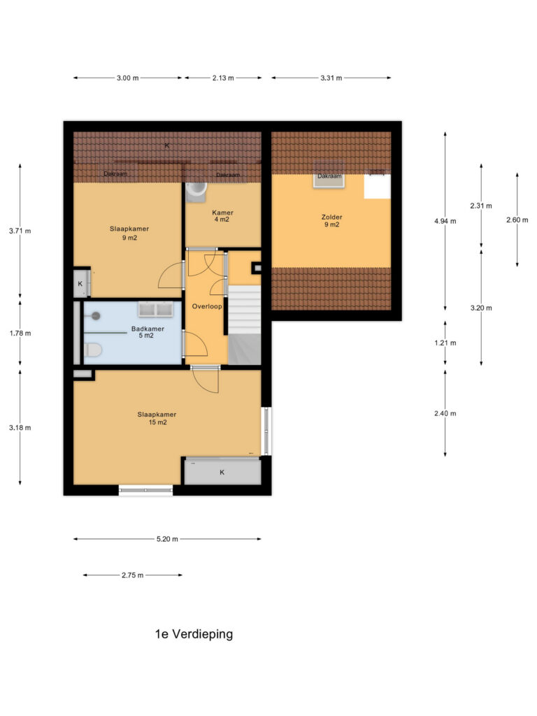 Overloop, drie slaapkamers van respectievelijk 4, 9 en 15 m². De kamer boven de garage (9m²) is eventueel bereikbaar te maken vanaf deze verdieping.