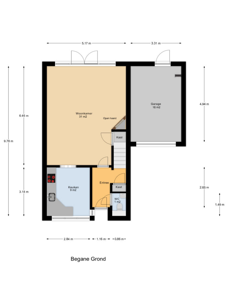 Entree, hal met toilet, meterkast en toegang naar de woonkamer. De woonkamer heeft een lichte tegelvloer met vloerverwarming en fraai zicht op de tuin. De nette keuken ligt aan de voorzijde van de woning. De keuken heeft een L-opstelling en beschikt over inbouwapparatuur. De keuken is nu dicht ten opzichte van de kamer en kan eenvoudig opengemaakt worden. Aan de achterzijde heeft de kamer grote ramen en daarmee veel lichtinval. De openslaande deuren geven toegang naar de tuin.