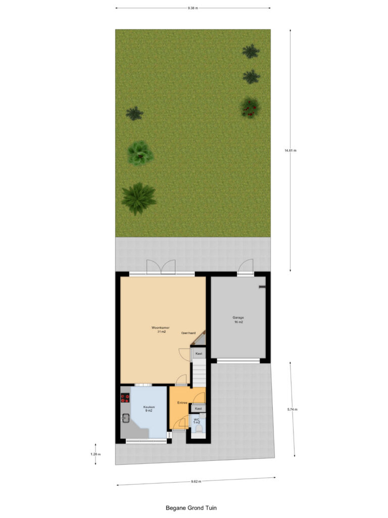De aangebouwde garage is 16 m² groot en heeft een grote bergzolder met een dakraam. Voor de garage is een parkeerplaats op eigen terrein.