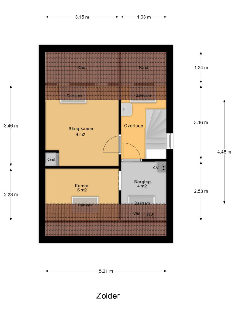 Overloop, berging van 4 m² met de wasmachine-aansluiting en CV-ketel. Twee kamers van respectievelijk 5 en 9 m². Al deze ruimtes beschikken over (nieuwe) dakramen.