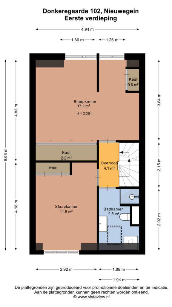 De trap naar de eerste verdieping is voorzien van pvc. Op deze verdieping zijn twee ruime slaapkamers van 17 en 12 m² groot, aan zowel de voorkant als de achterkant van de woning is er een dakkapel. Beide dakkapellen zijn bekleed met Keralit en onderhoudsarm. Er zijn momenteel twee slaapkamers op deze verdieping, oorspronkelijk waren dit er drie. Mocht het nodig zijn dan is dit weer eenvoudig terug te brengen naar drie slaapkamers. De lichte badkamer uit 2023 is circa 4,5 m² groot en is voorzien van een zwevend toilet, wastafelmeubel, inloopdouche, designradiator, wasmachineaansluiting en dakraam.