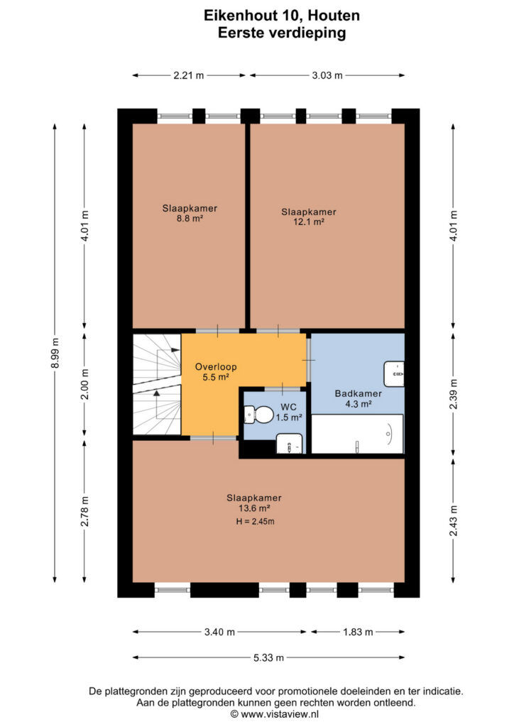 Op de eerste verdieping bevinden zich twee slaapkamers aan de achterzijde en een riante derde slaapkamer over de volle breedte aan de voorzijde. De overloop biedt toegang tot een separaat toilet en de badkamer, die is voorzien van een ligbad en een vaste wastafel.